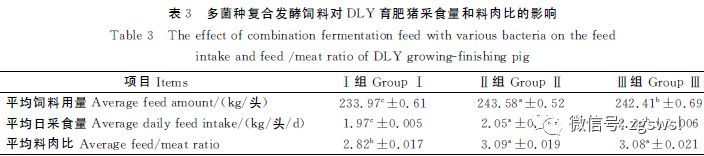 3組DLY育肥豬的采食量和料肉比結(jié)果見表3。從表3知,平均飼料用量和平均日采食量,Ⅱ組,Ⅰ組小,Ⅱ組與Ⅰ組和Ⅲ組相比差異顯著(P<0.05),Ⅰ組與Ⅲ組相比差異顯著(P<0.05)。平均料肉比,Ⅰ組小,分別比Ⅱ組和Ⅲ組低8.7%、8.4%;Ⅱ組和Ⅲ組表現(xiàn)差異不顯著(P>0.05),與Ⅰ組相比差異顯著(P<0.05)??梢?,與Ⅱ、Ⅲ組相比,多菌種復(fù)合發(fā)酵飼料組的平均日采食量少且平均料肉比小。