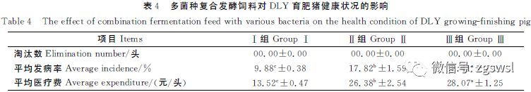 3組DLY育肥豬的發(fā)病率和醫(yī)療費(fèi)用結(jié)果見表4。從表4可知,試驗(yàn)中各組豬均沒有死亡淘汰,但發(fā)病率有所差別。平均發(fā)病率,Ⅲ組,Ⅰ組,Ⅲ組與Ⅱ組和Ⅰ組相比差異顯著(P<0.05),Ⅱ組與Ⅰ組相比差異顯著(P<0.05),Ⅰ組分別比Ⅱ組和Ⅲ組低44.6%、49.1%。平均醫(yī)療費(fèi)用,Ⅲ組,Ⅰ組,Ⅲ組與Ⅱ組和Ⅰ組相比差異顯著(P<0.05),Ⅱ組與Ⅰ組相比差異顯著(P<0.05),Ⅰ組分別比Ⅱ組和Ⅲ組低48.7%、51.8%。可見,與Ⅱ、Ⅲ組相比,多菌種復(fù)合發(fā)酵飼料飼喂的DLY育肥豬發(fā)病率小,平均每頭豬的醫(yī)療費(fèi)用少。